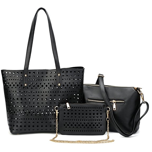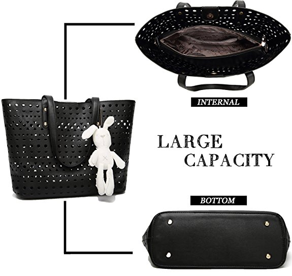Buy 1 get 4! This set includes large tote bag, a medium crossbody bag with adjustable shoulder strap, a small purse with a gold-tone chain shoulder strap, a cute plush bunny, and a non-woven dust bag.