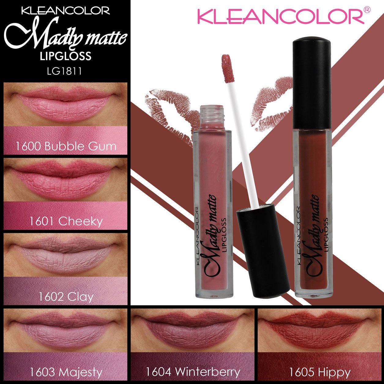 Madly Matte Lipgloss provides rich color in a matte finish for all day wear without drying. It goes on as a highly pigmented liquid and dries to a smooth matte finish. Lips are colored in velvety perfection that lasts. So grab one and go! You're off to a smooth start with Madly Matte Lip Gloss from Kleancolor.